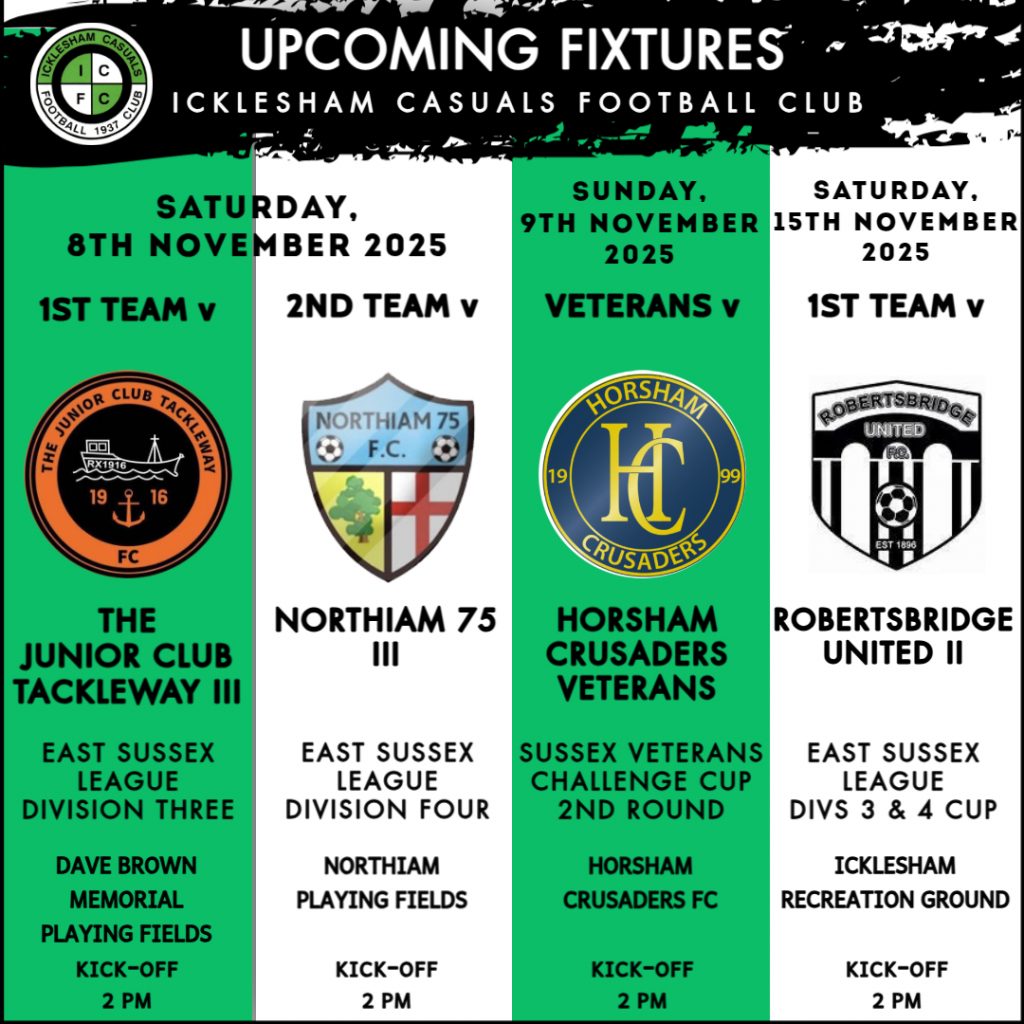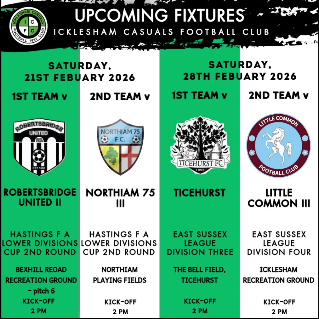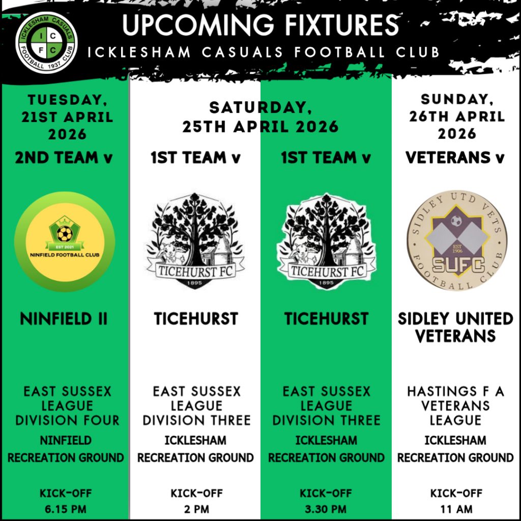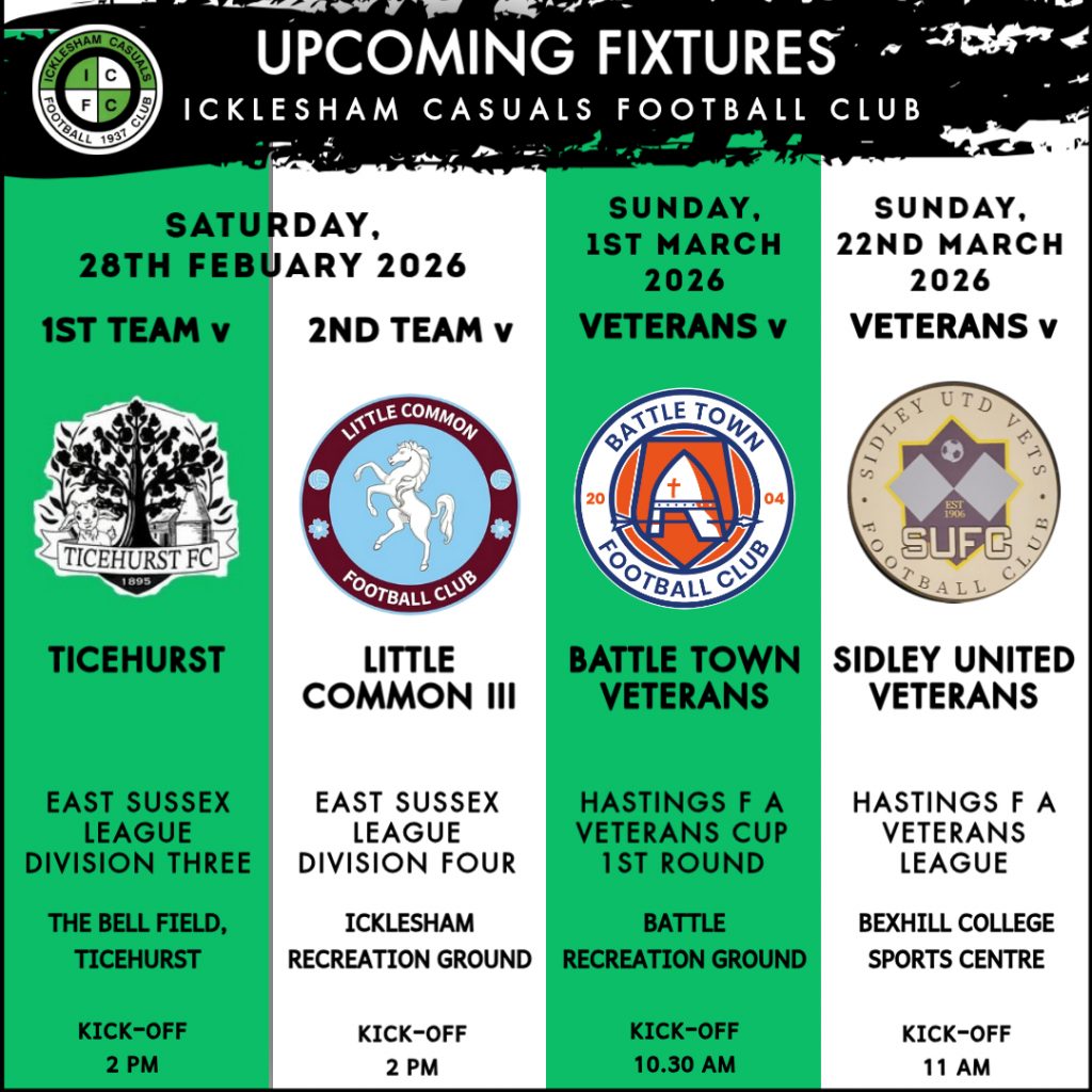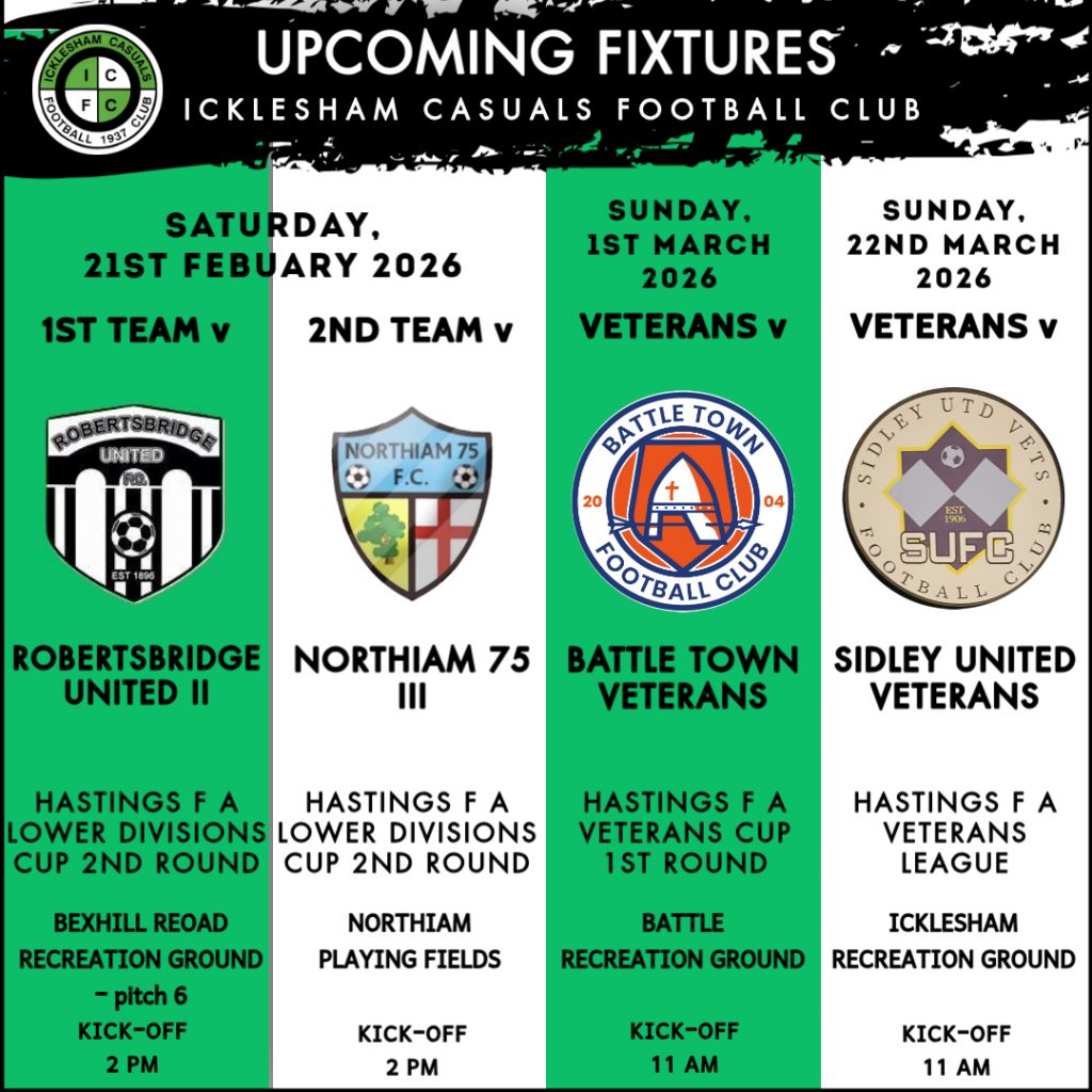 Icklesham Casuals Football Club is a friendly village club situated between Hastings and Rye and has a history of which it can be proud. For the 2025-26 season, the Club will be running two adults teams in the East Sussex Football League and a veterans side competing in the Hastings F A Veterans League.