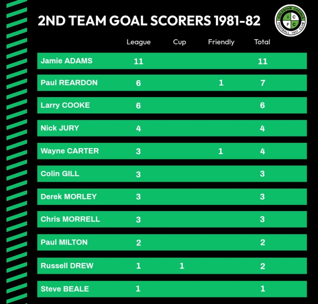 In spite of a lack of a settled team – no less than thirty five players were used between Christmas and the end of the season – the 2nd team had quite a good year, averaging a point a game in the league and as joint runners-up in for the Sportsmanship Trophy, did the Club credit. Tim Jury, as captain, set a good example until injured and Chris Morrell, George Potter and Nick Jury led the side well in the latter part of the season. Jamie Adams top scored with 11 goals.