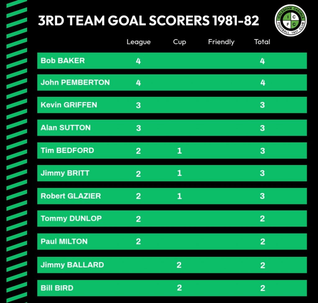 | 24/10/1981 | Young Concern 81 | Away | League | 3 – 10 | Paul Milton 2, John Pemberton |