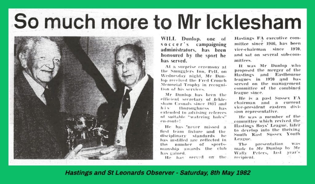 At a surprise ceremony held at the Smugglers Inn, Pett on Wednesday, 5th May 1982, Club secretary William Dunlop was awarded the Fred Crouch Memorial Trophy in recognition of his service to local football. The presentation was made by Wally Peters, the previous recipient of the award.