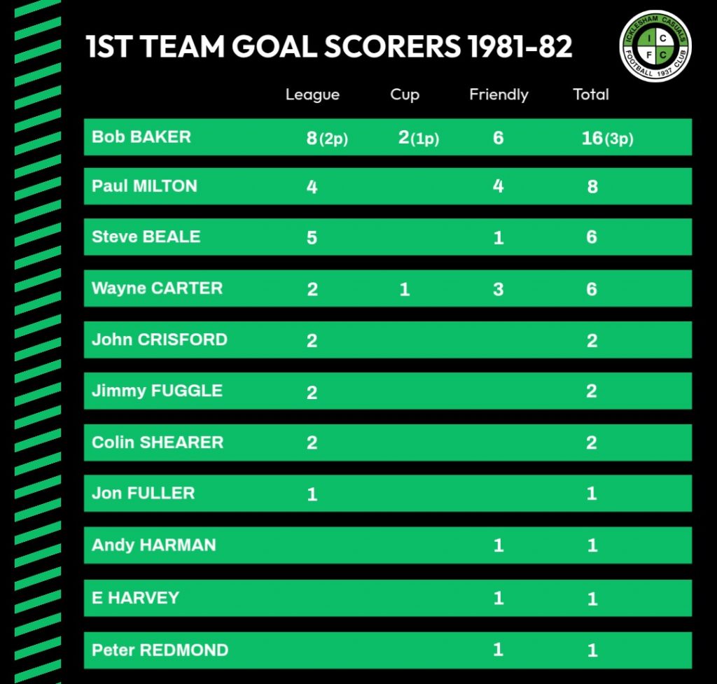 | 30/1/1982 | Rock-a-Nore | Home | Robertsbridge Charity Intermediate Cup 2nd Round | 3 – 4 | Bob Baker 2 (1 pen), Wayne Carter |