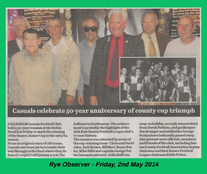 A reunion to mark the 50th anniversary of the greatest achievement of the Club to date, the 1st team winning the Sussex Junior Cup in the 1963-64 season from an entry of one hundred and sixty eight teams, was held at the Robin Hood in Icklesham on Friday, 25th April 2014.