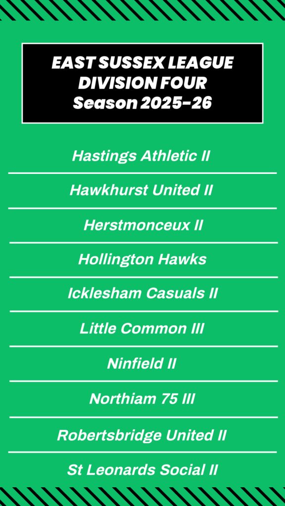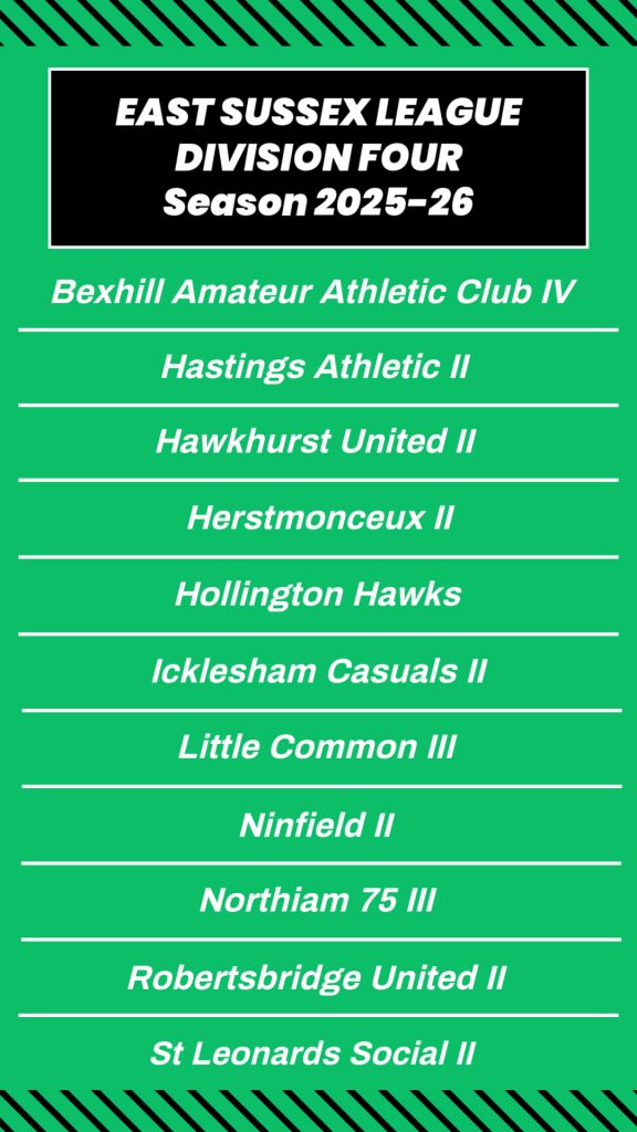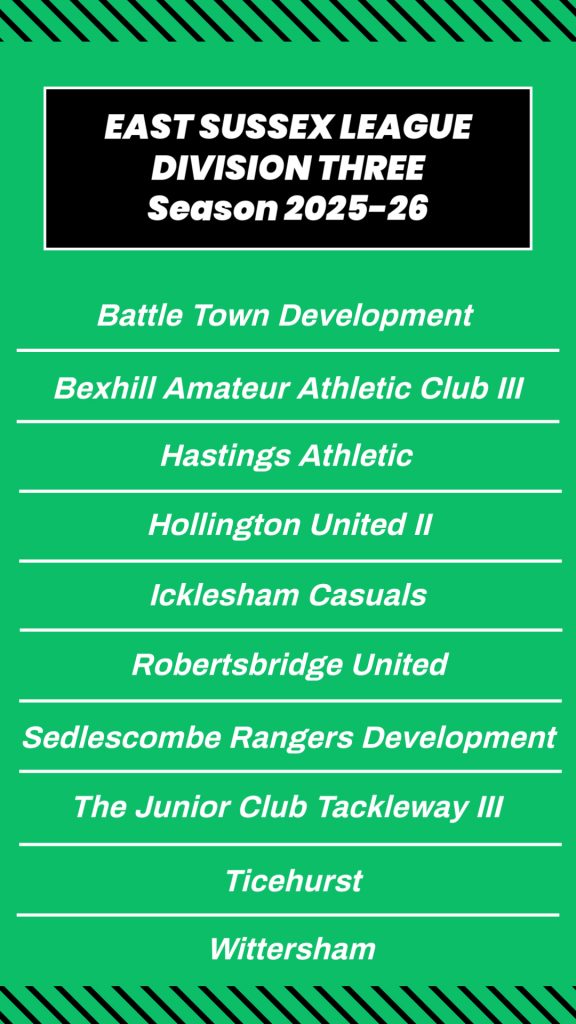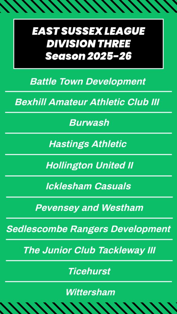 The composition of the League will be – Battle Town Veterans, Bexhill Amateur Athletic Club Veterans, Crowhurst Veterans, FC Parker 99 Veterans, Icklesham Casuals Veterans, Little Common Veterans, Sedlescombe Rangers Veterans, Sidley United Veterans and Westfield Veterans.