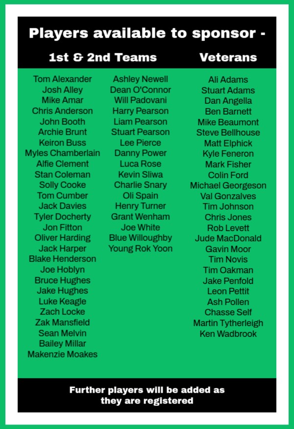 The Club would like to thank Botley’s Taxi, The Rye Chauffeur, Liz Pendennis of EW Production Services Limited and Stuart and Mags Baker for their kind sponsorship of players for the 2025-26 season.