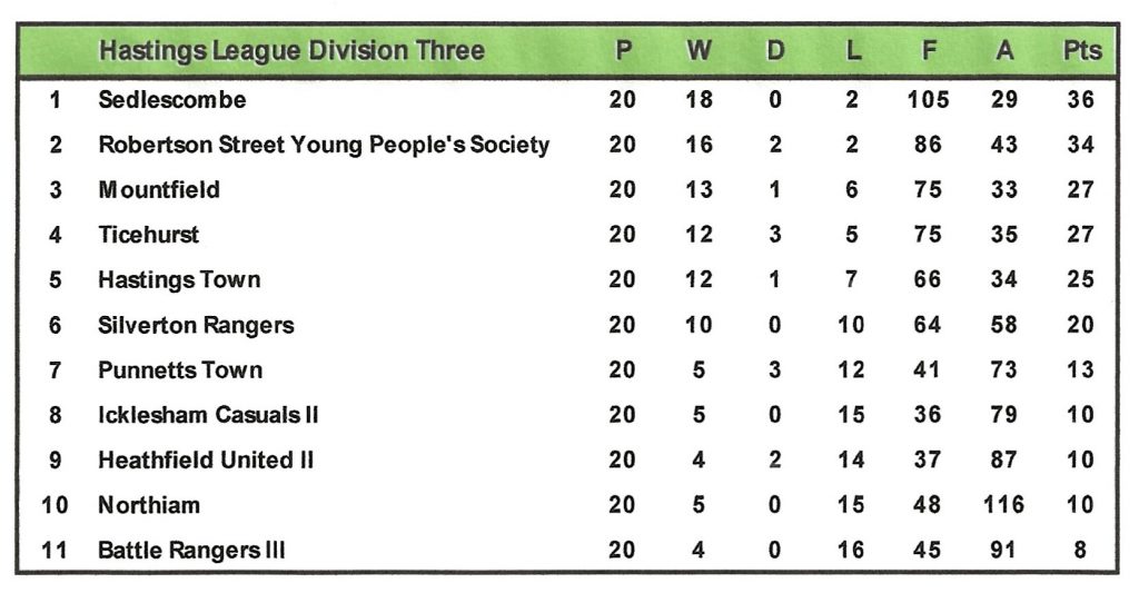 Cyril Jeffery played in all but one of the twenty-nine matches and John Parsons (27), Dick Crisford and Fred Swaine (25 each) and Frank Baker (24) all appeared regularly. Arthur Watkins led the goal scorers with 21 goals, including eight in the 11-0 Hastings Junior Cup win away to Northiam. Arthur missed the 1st team’s victory at Robertsbridge in the 3rd round of the Sussex Junior Cup as he was being sworn in as a policeman in Hastings and then a further four months of the season whilst attending Police Training College. Frank Baker also netted on 13 occasions.