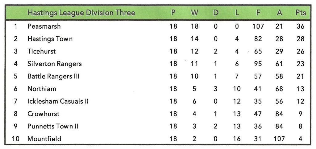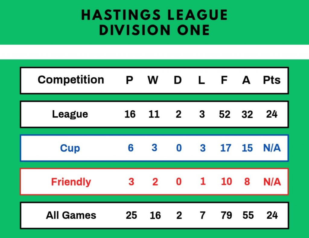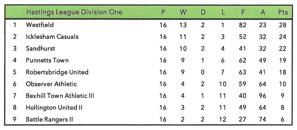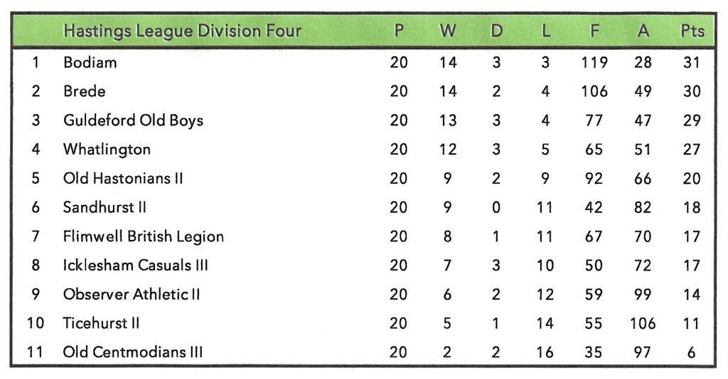 In a small league of only nine teams, two new Club records were set – the lowest number of points dropped in a season (eight) and undefeated at home all season in league games. The team was not so free from injuries as Westfield, but basically the side was picked from about twelve players – Dick Crisford, Fred Swaine, Tony Gibson, David French, Colin Willard, Trevor Vince, George Noakes, John Parsons, Arthur Baker, David Cooke, John Clarke and Frank Baker, though Denis Care and John Dunk made several appearances. David French and George Noakes played in both representative games against the Hailsham League. With 23 goals, mostly from the left wing, Frank Baker was leading scorer in all games. Arthur Baker was close behind with 20 goals. David French played in all twenty-five matches and George Noakes missed just one game. Unpunctuality cost the team one or two goals as well as a good deal of anxiety and ill-temper.