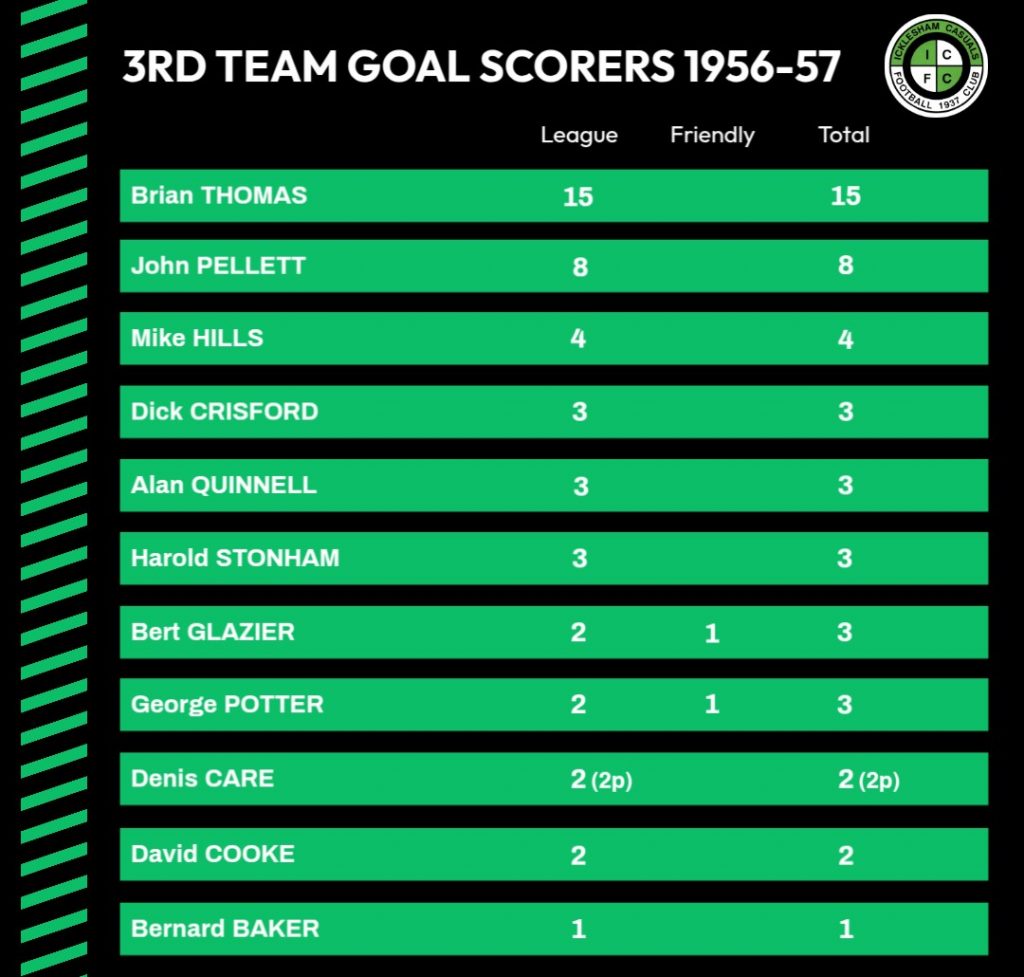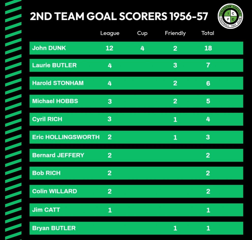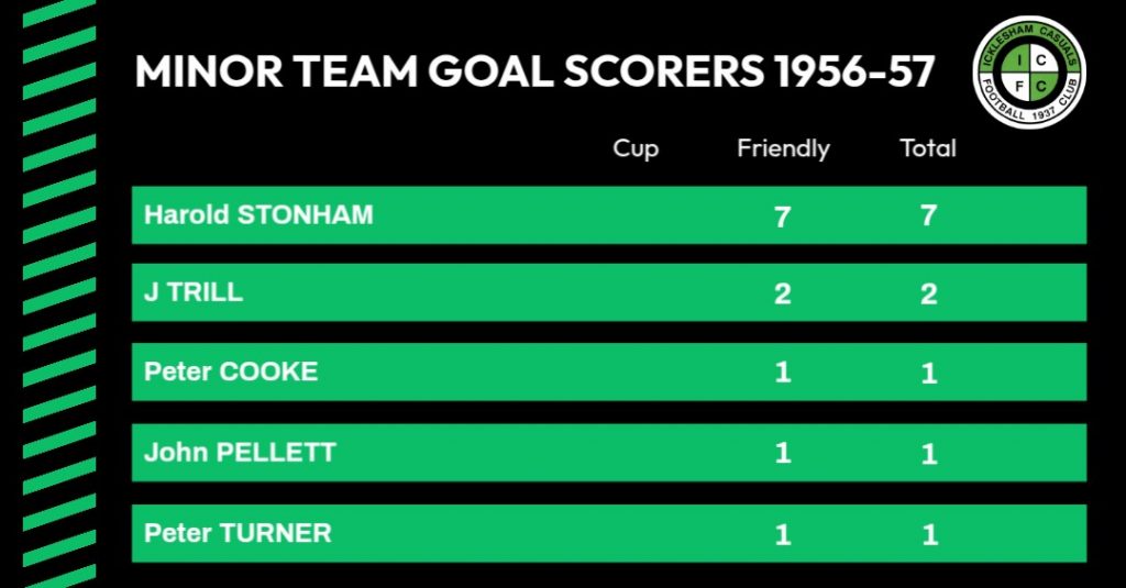 | 23/2/1957 | Old Hastonians III | Home | Friendly | 8 – 0 | Laurie Butler 2, John Dunk 2, Bryan Butler, Denis Swaine, Eric Hollingsworth, Harold Stonham |