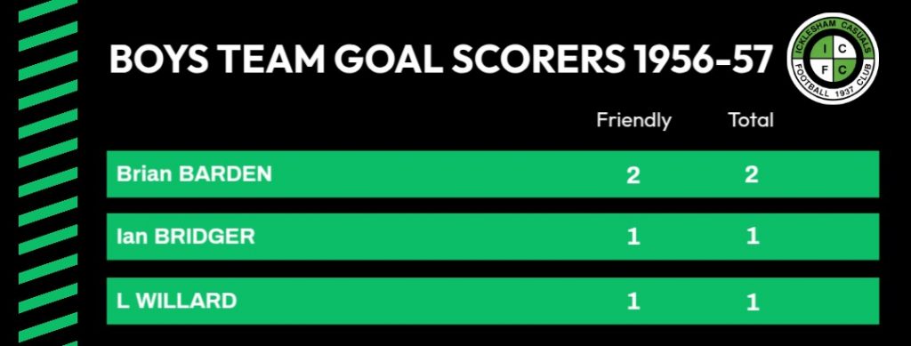 | 29/4/1957 | West Hill Boys Club Juniors | Away | Friendly | 2 – 3 | Brian Barden, Ian Bridger |