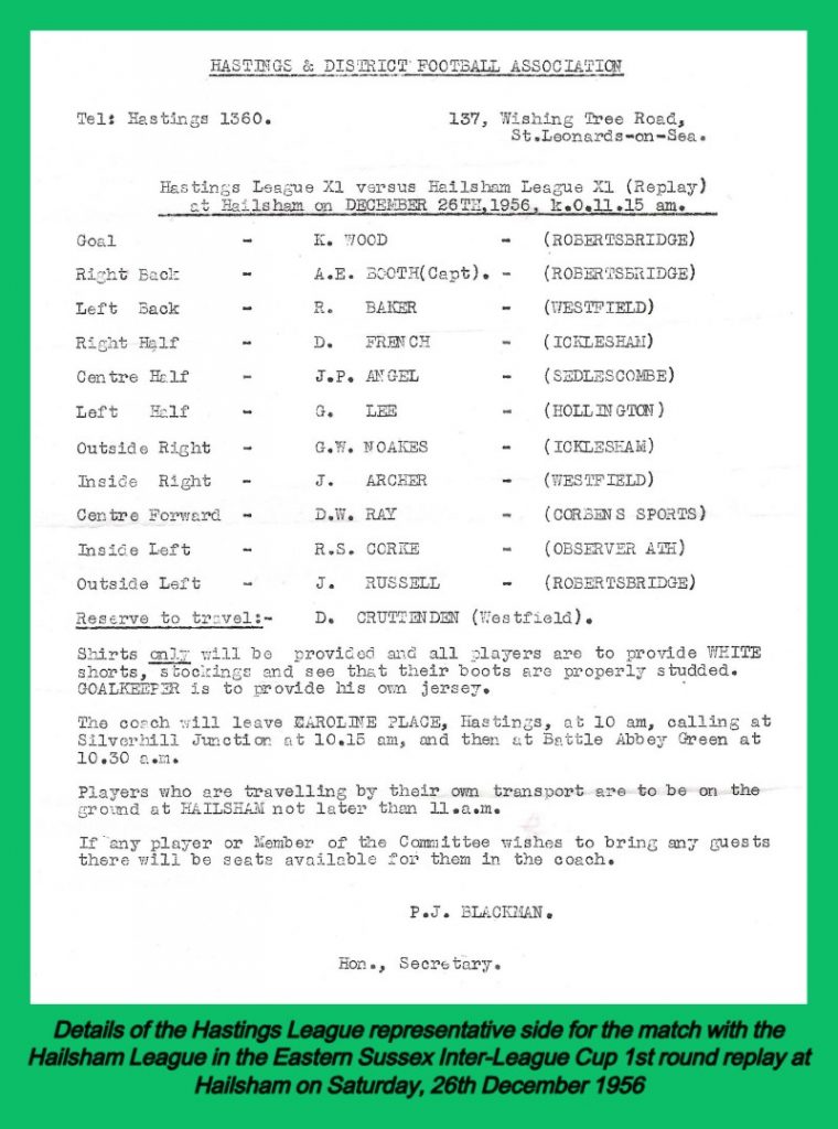 | 1/12/1956 | Peasmarsh | Away | Hastings F A Junior Cup 2nd Round | 6 – 3 | Arthur Baker 2, Frank Baker 2, George Noakes, Denis Care (pen) |