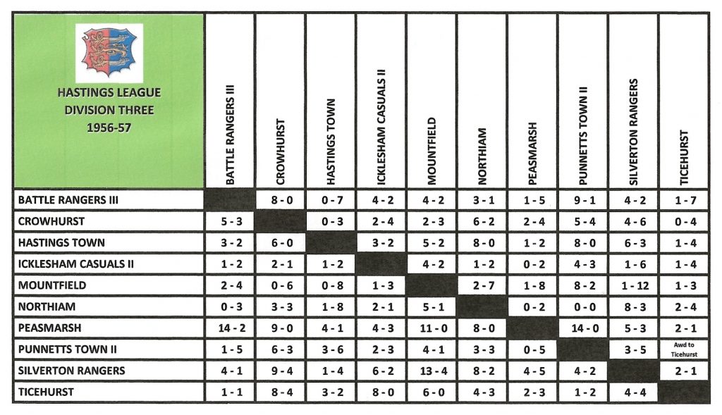 | 30/3/1957 | Bodiam | Away | League | 0 – 7 | |