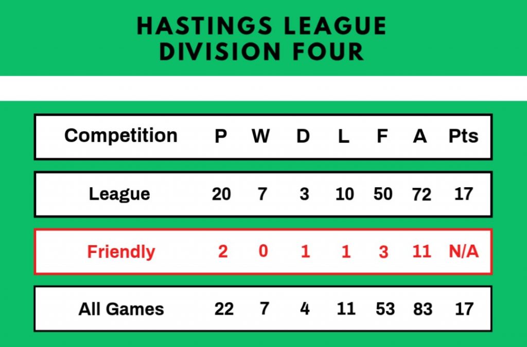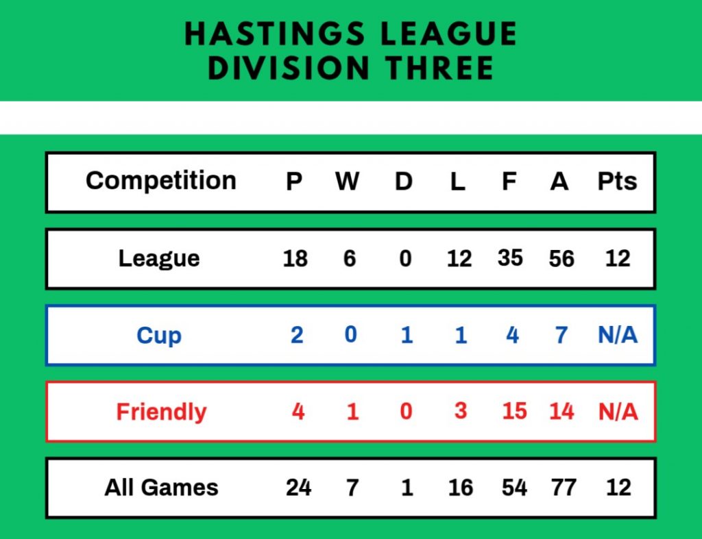 Five minor games were played, one in the Hastings Youth Cup and four friendlies. These matches gave football to some boys who did not get a regular game in Division Four. In addition, a boys team of 12-15 year olds played two friendlies at the end of the season.
