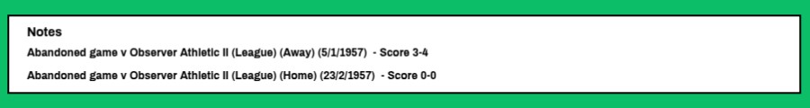 | 2/3/1957 | Observer Athletic II | Away | League | 3 – 3 | John Pellett, George Potter, Harold Stonham |