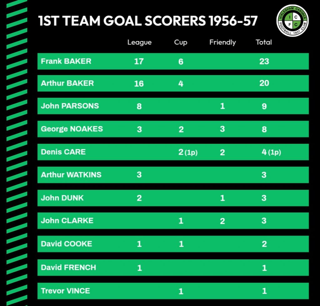 | 9/2/1957 | Punnetts Town | Home | League | 4 – 2 | Frank Baker 2, George Noakes, Arthur Baker |