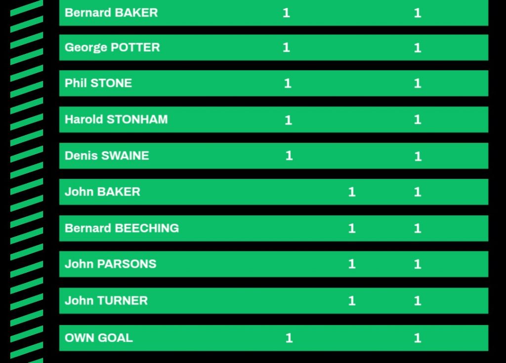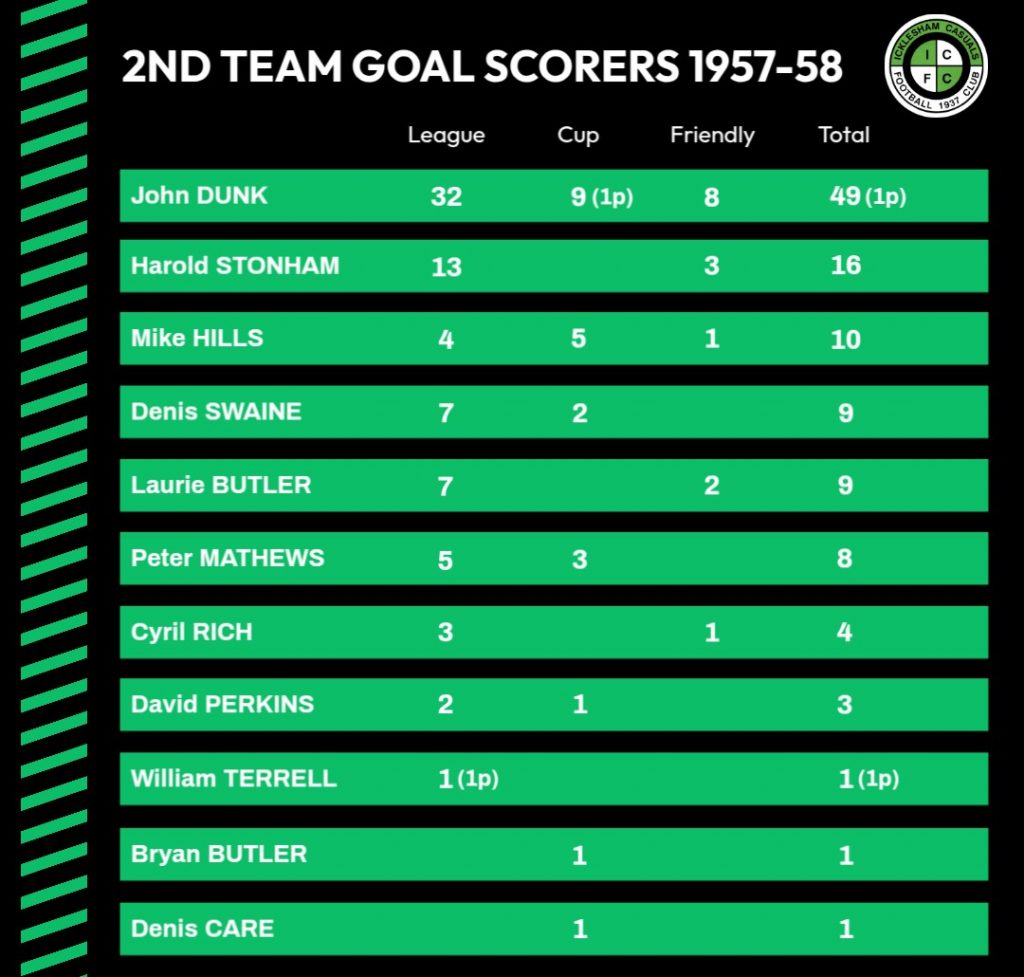 | 26/4/1958 | Old Hastonians II | Home | League | 3 – 4 | Denis Swaine, John Dunk, Harold Stonham |