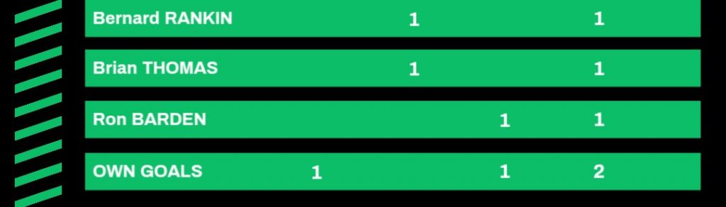 | 16/11/1957 | Battle Rangers III | Away | League | 3 – 0 | Peter Mathews, Denis Swaine, Harold Stonham |