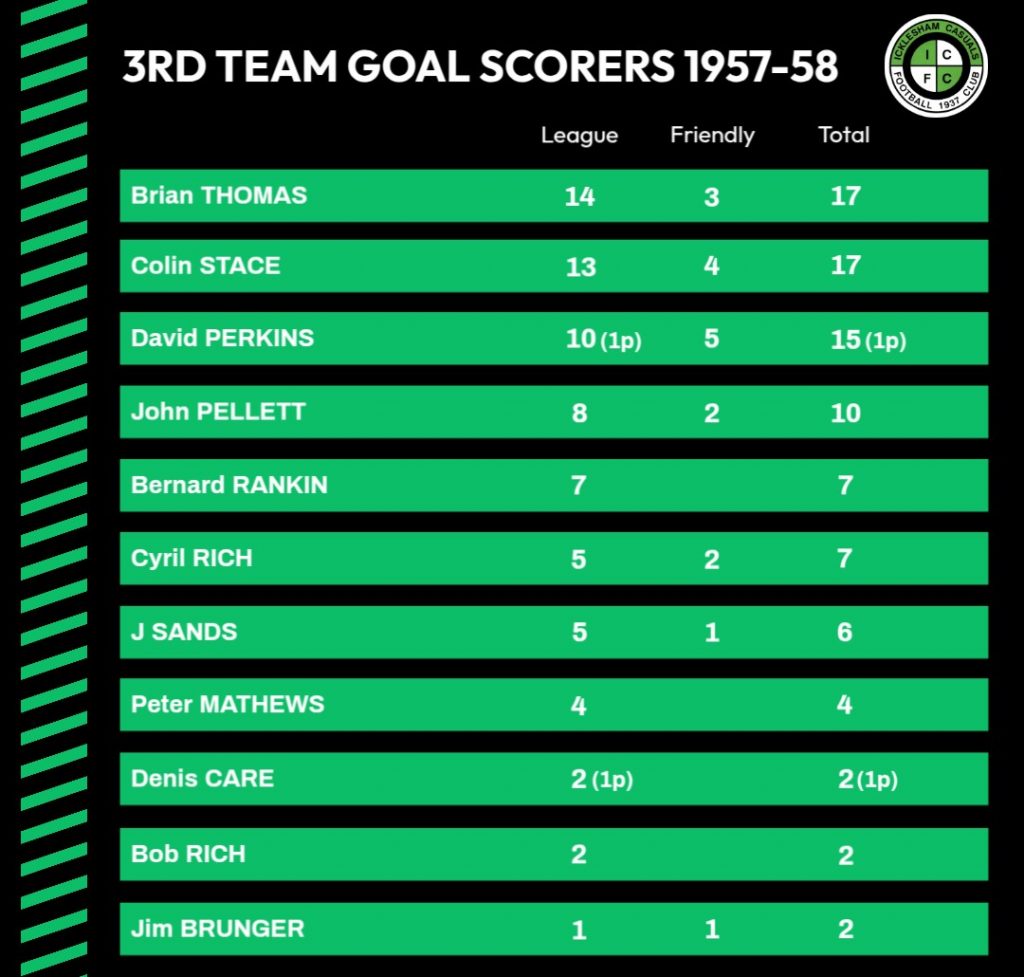 | 21/12/1957 | Peasmarsh II | Home | League | 3 – 0 | Brian Thomas, Denis Swaine, David Perkins |