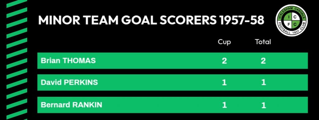 | 14/12/1957 | Bexhill Minors | Home | Hastings F A Youth Cup 2nd Round | 4 – 2 | Brian Thomas 2, David Perkins, Bernard Rankin |