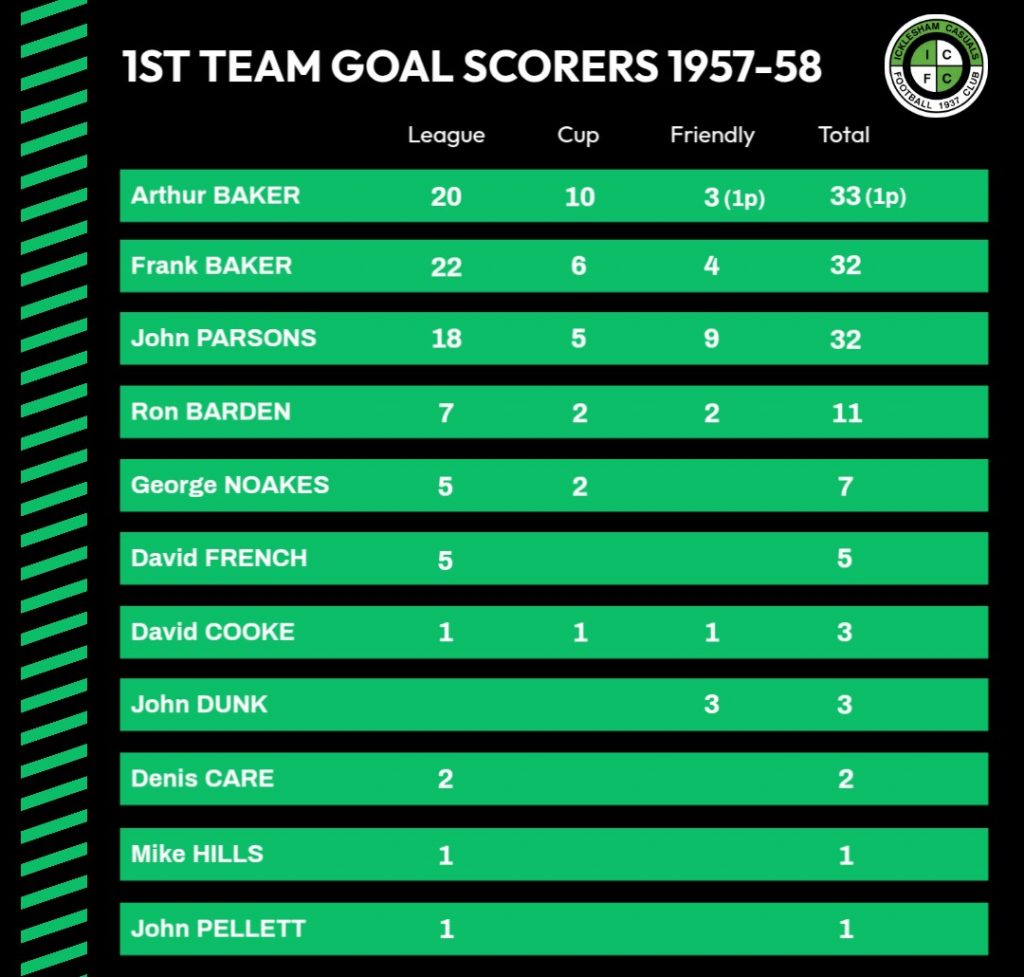 | 5/4/1958 | Sedlescombe United | Away | League | 7 – 1 | John Parsons 2, Arthur Baker, Ron Barden, Frank Baker, Own Goals 2 |