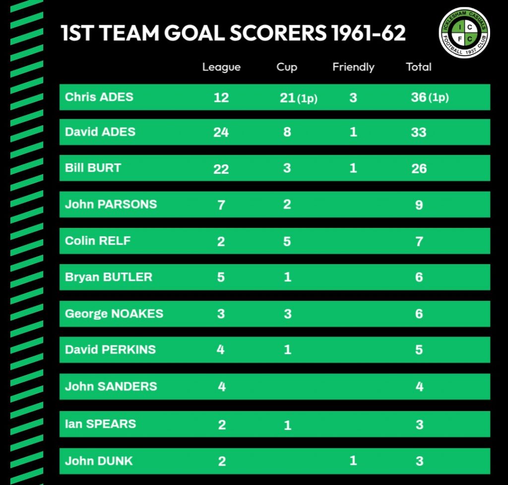 6/1/1962Observer AthleticAwayLeague8 – 1David Ades 4, Chris Ades 2, George Noakes, Bill Burt