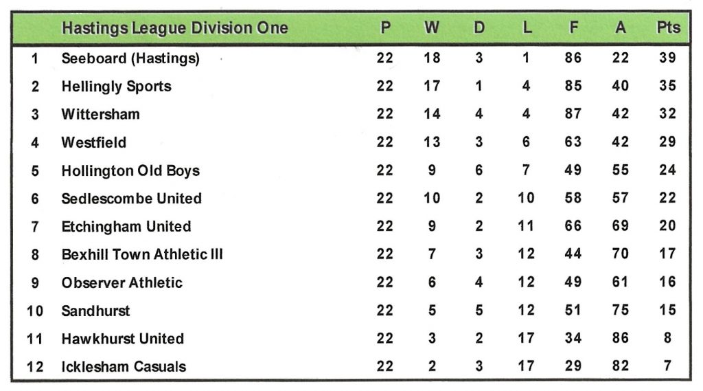 In this rather depressing situation a great deal of responsibility fell to the captain, George Potter, and to the regular players and the improved form late in the season was due to their perseverance in discouraging circumstances. Michael Hills did not miss a league or cup game and George Potter captained the Hastings League against the Mid-Sussex League. Stephen Williams (goalkeeper) and Colin Shearer (outside-right) were in the Hastings and District youth party which took part in an International Youth Tournament in Germany, while Michael Pfundstein improved fast with Division One experience and Stephen Turner showed real promise without ever quite acclimatising himself to the faster pace in Division One. Brian Barden with just 8 goals, including one penalty, was top goal scorer.
