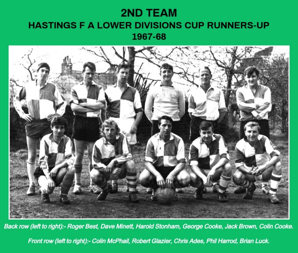 The second team were hit by the claims of the depleted first XI and never looked like having a great season for that reason. They did, however, reach the final of the Hastings Lower Divisions Cup, beating Sandhurst II, Brede, West Hill Boys Club and Etchingham United II before losing 3-0 to College in the final at Westfield. The team which competed in the final was: George Cooke, Brian Luck, Colin Cooke, Colin McPhail, Jack Brown (captain), Robert Glazier, Roger Best, Chris Ades, Dave Minett, Phil Harrod and Harold Stonham.