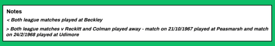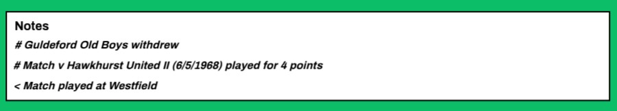 14/10/1967Guldeford Old Boys IIAwayLeague6 – 2Peter Thorpe 2, Bert Glazier 2, Roger Best, Micky Pfundstein