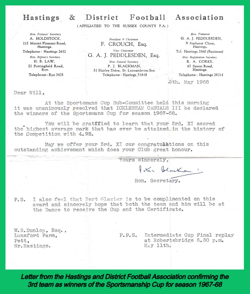 The 1967-68 season was a mixed one. The first team had their poorest year since the war and were relegated, the second team had a moderate season but reached the final of the Hastings League Lower Divisions Cup while the third team had a good playing record and won the Hastings League Sportsmanship Cup with record high marks.