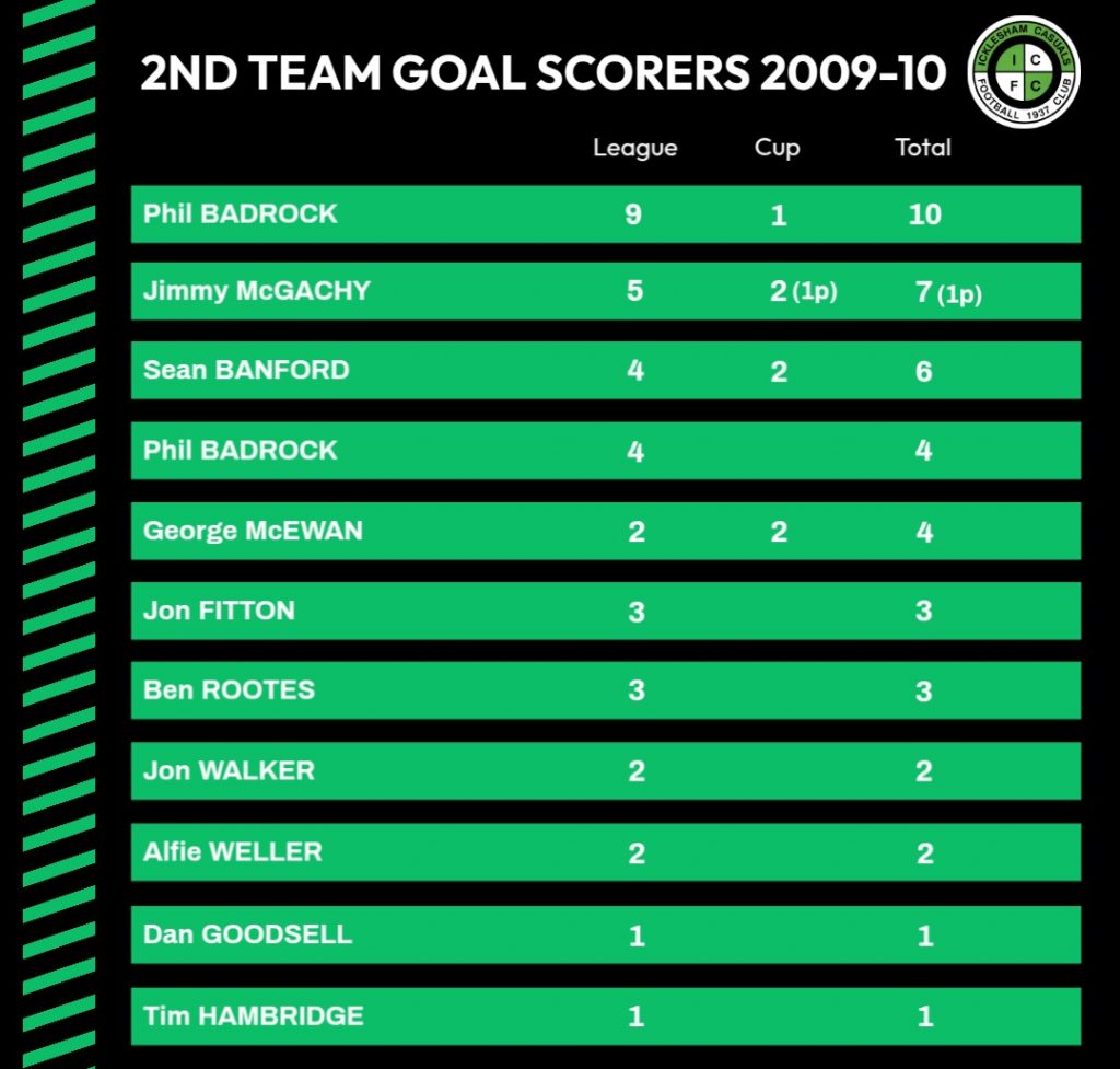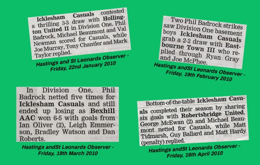 | 14/4/2010 | Burwash | Away | League | 6 – 0 | Phil Badrock 2, Jimmy McGachy, Greg Palmer, Ben Rootes |