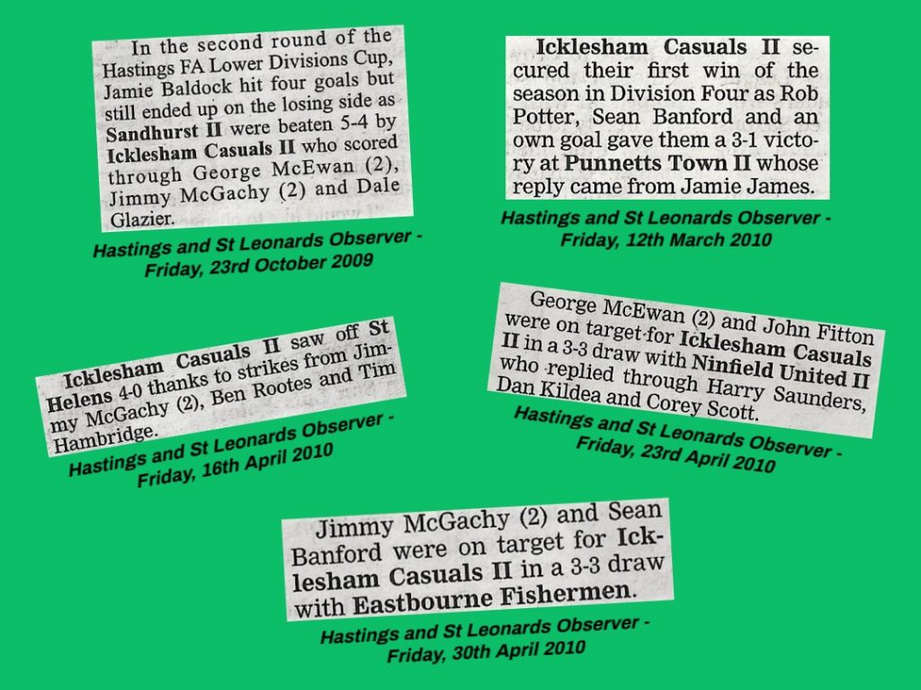 | 17/4/2010 | Ninfield United II | Home | League | 3 – 3 | George McEwan 2, Jon Fitton |