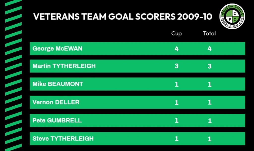 | 2/9/2009 | The Junior Club Tackleway Veterans | Home | Hastings F A Veterans Cup | 7 – 0 | George McEwan 3, Vernon Deller, Pete Gumbrell, Martin Tytherleigh, Steve Tytherleigh |