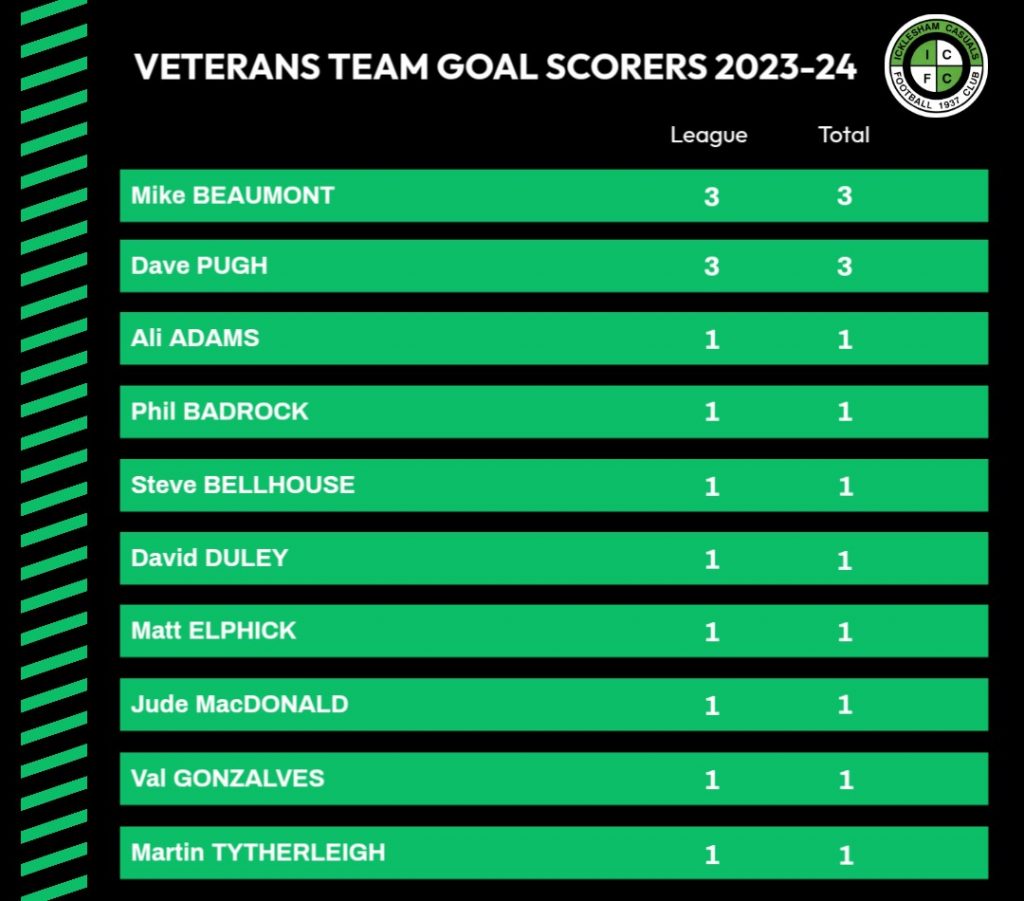 | 12/5/2024 | Robertsbridge United Veterans | Away | League | 3 – 1 | Mike Beaumont, Martin Tytherleigh, Jude McDonald |