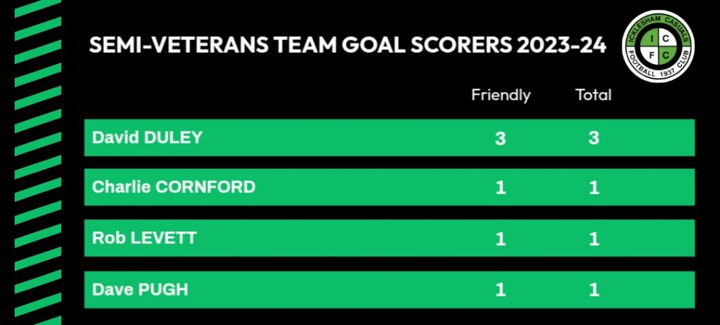 | 2/8/2023 | Icklesham Casuals Semi-Veterans | Home | Friendly | 7 – 6 | Tom Cumber 4, Solly Cooke, Luke Townsend, Callum Badrock |