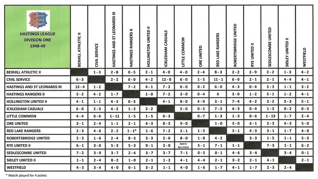 26/2/1949Bexhill Athletic IIHomeLeague6 – 0Charlie Ades 3, Oliver Campbell, Frank Baker, John Howell