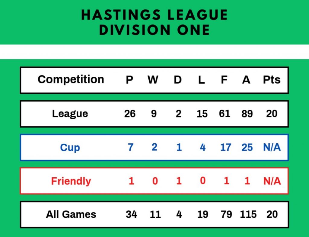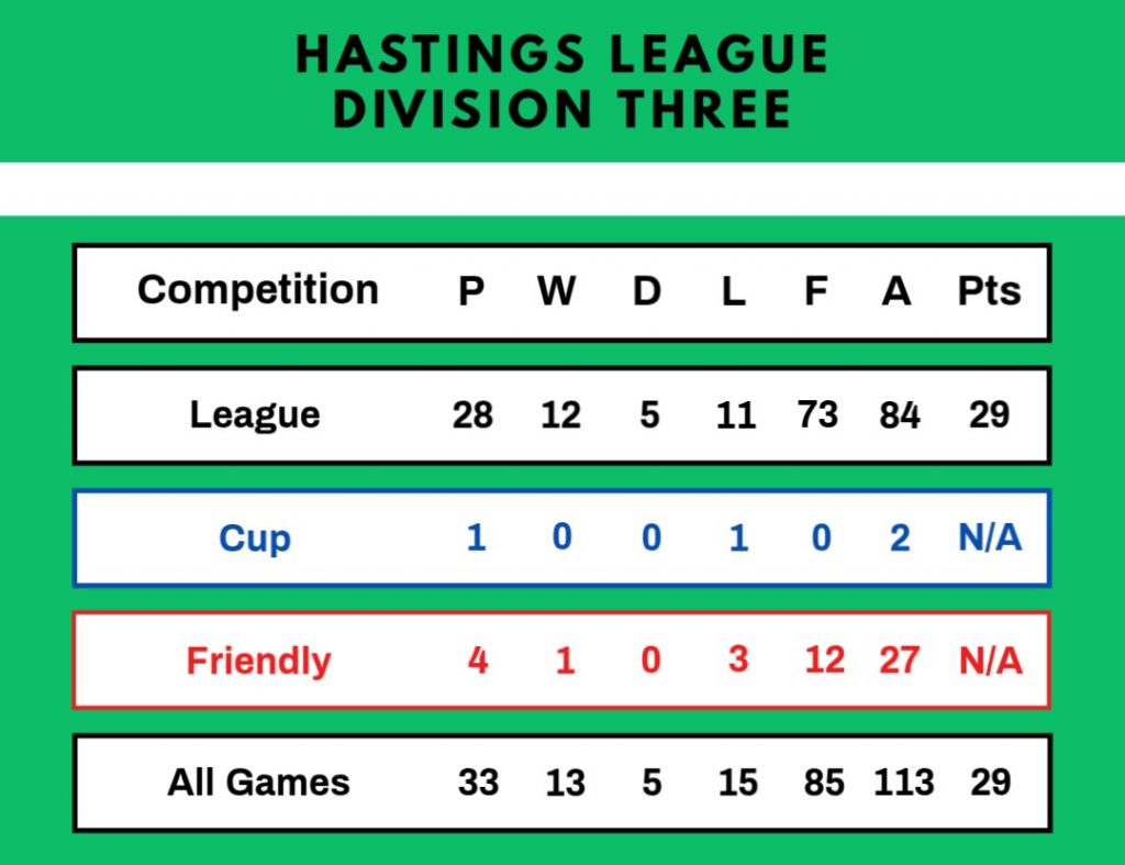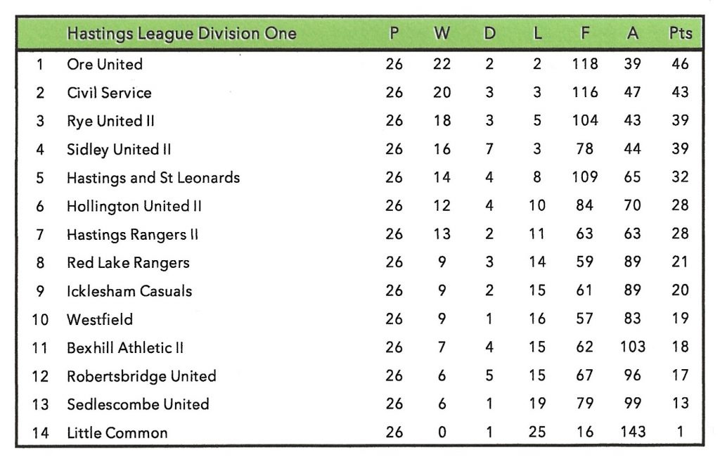 The first team finished in ninth position out of fourteen teams in the Hastings League Division One, with a playing record rather inferior to that of the previous year. They were knocked out of the Hastings Junior and Sussex Junior Cups in the second round and lost at the first attempt in the Rye Charity Cup. The overall league record showed twenty-six games played, nine wins, two draws, fifteen defeats and twenty points gained, but it is interesting to compare a very unsuccessful first half of the season with one win, one draw and eleven defeats in thirteen matches with the second half where eight wins and a draw were achieved with just four defeats.