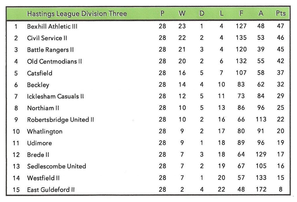 The second team had a better season in Division Three of the Hastings League and also competed in the Robertsbridge Charity Cup where they lost to Winchelsea in the first round. This was the first cup match the side had played. In the league the team finished seventh out of fifteen clubs gaining twenty-nine points from twenty-eight games, with twelve wins, five draws and eleven defeats. Leading scorers were Harry Fellows (19 goals), Cyril Jeffery (16), Cyril Rich (13) and Jack Brown (11).