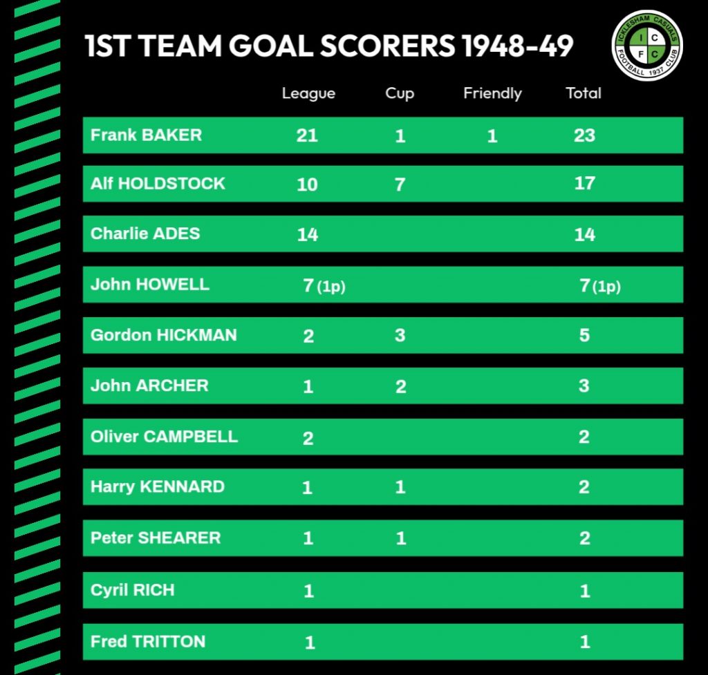 18/4/1949Little CommonHomeLeague5 – 0Charlie Ades 2, Frank Baker 2, Alf Holdstock