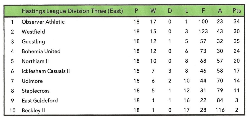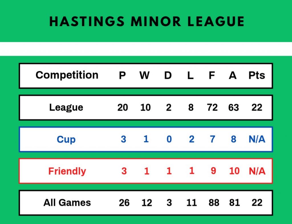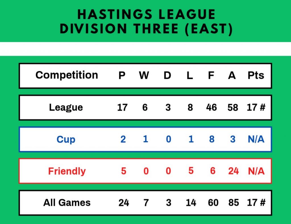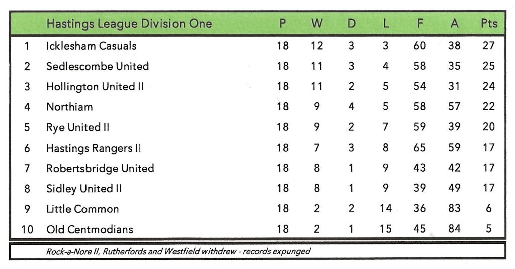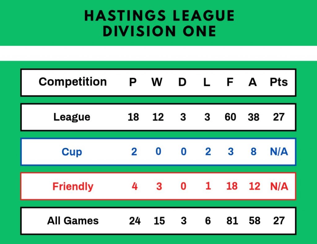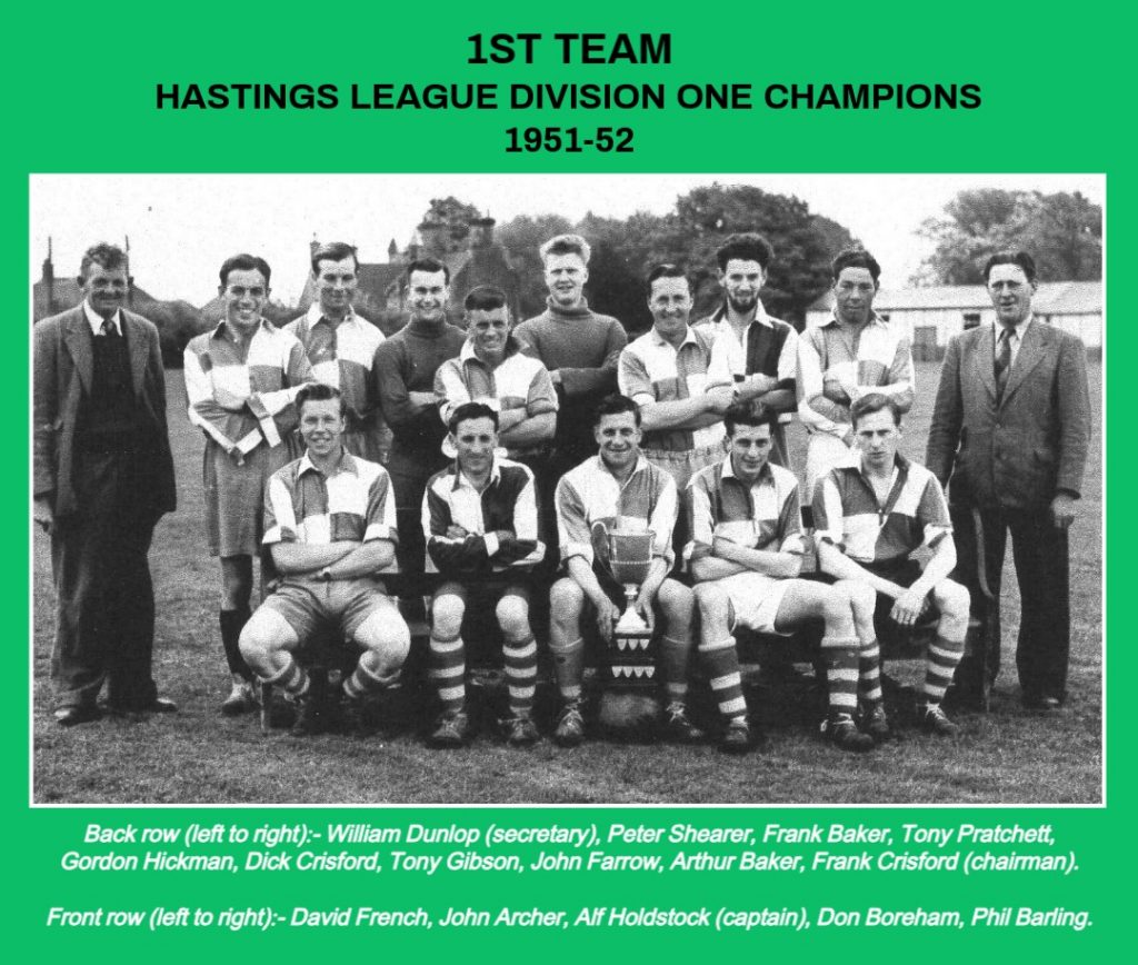 A sound all-round settled side, disturbed only by forced team changes, scored freely and did not concede many goals. Frank Baker and Don Boreham played in every game and Tony Gibson missed just one match. Leading scorers were Phil Barling (21 goals), Arthur Baker (19) and Frank Baker (17). John Archer played right-half for the Hastings League against the Lewes League at Newhaven.