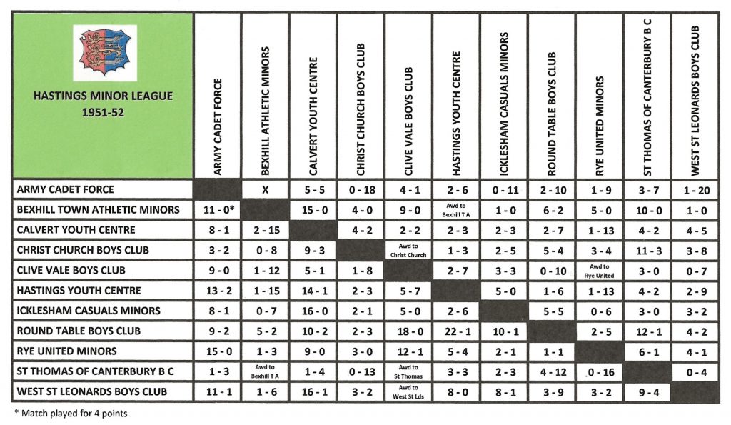| 20/10/1951 | West St Leonards Boys Club | Home | League | 3 – 2 | Brian Chapman 2, Peter Wood |