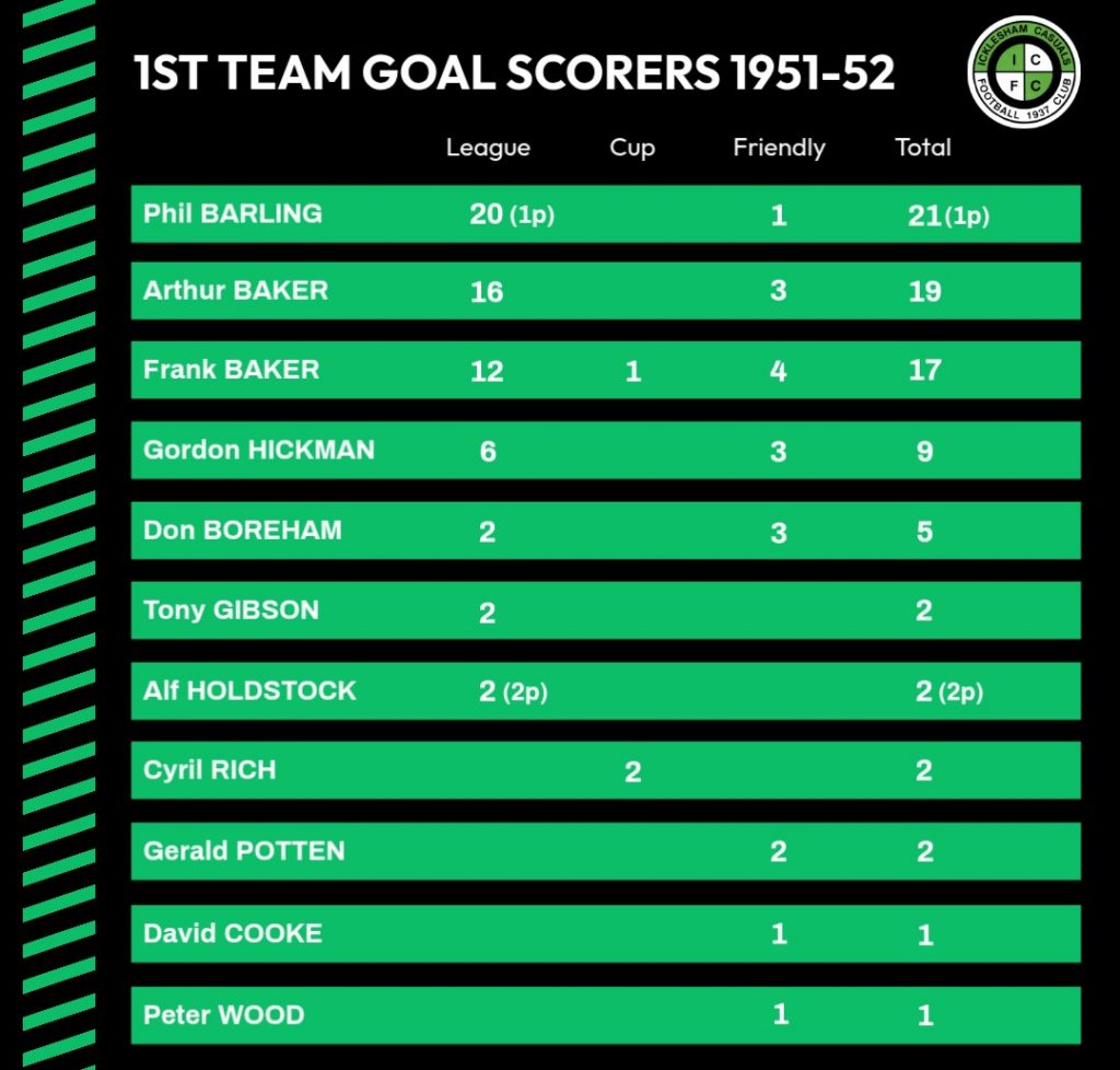 | 15/12/1951 | Northiam | Home | League | 5 – 3 | Phil Barling 2, Arthur Baker 2, Frank Baker |