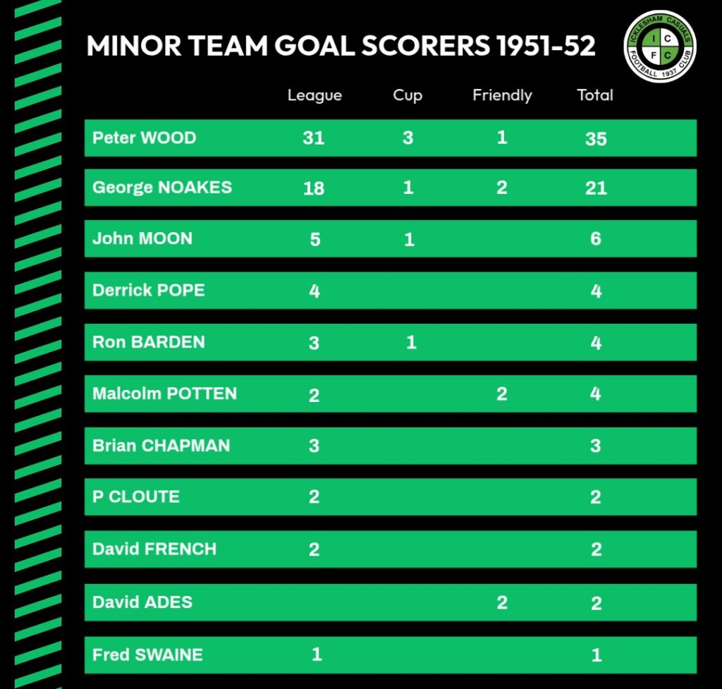 | 24/11/1951 | Army Cadet Force | Home | League | 8 – 1 | Peter Wood 2, George Noakes, Ron Barden, Malcolm Potten, John Moon, Derrick Pope, Michael Wise |