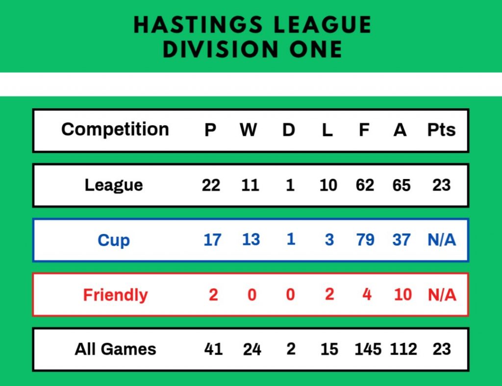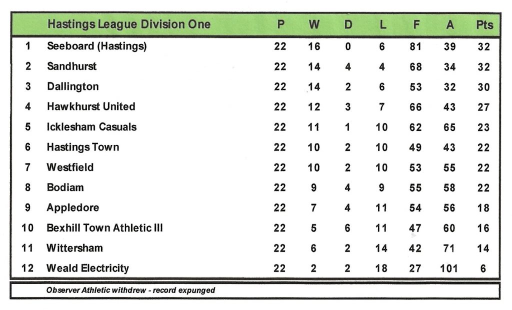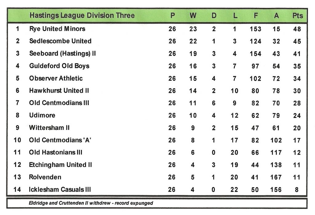 George Potter led the team well and on the whole a high standard of sporting play was displayed with the odd incidents being few and far between. Chris Ades with 40 goals was top scorer followed by his brother David with 31 and Brian Barden who found the net 21 times. George Potter and David Ades appeared for the Hastings League against the Hailsham League. In the Hastings Junior Cup, the side reached the semi-final for the fifth time but as on all the previous occasions they were knocked out at this stage.