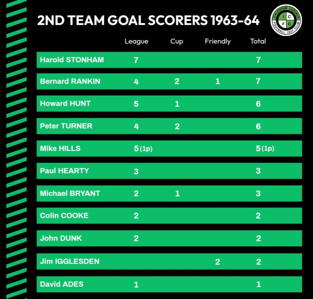 18/1/1964 | Old Hastomians ‘A’ | Away | League | 7 – 2 | Harold Stonham 2, Colin Cooke, Peter Turner, Mick Hills, Bernard Rankin, Own Goal |