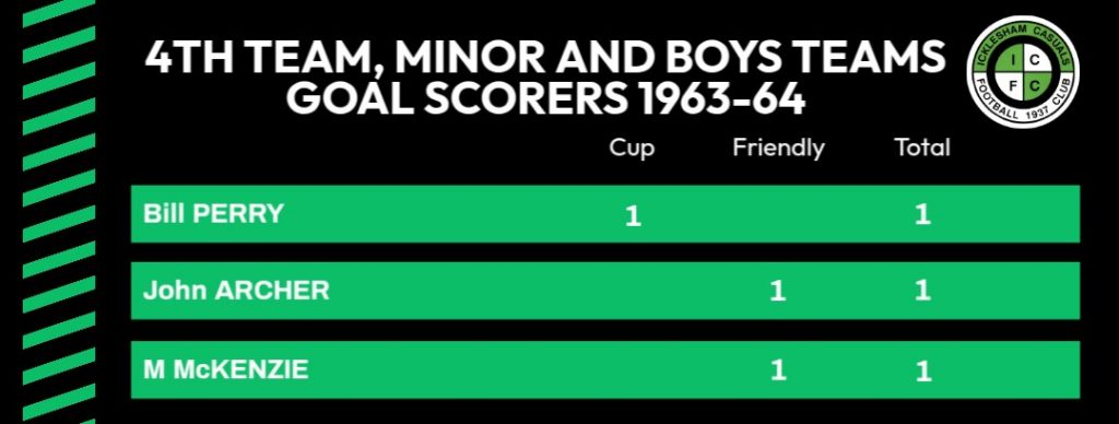In spite of the fact that the 3rd team, as usual, lost most of their games, they showed an improvement. The fifty four league goals scored was the highest since the 1957-58 season and at the end of a very long season there were plenty of players ready to turn out and play enthusiastically regardless of results. Bert Glazier again took much credit for this for managing the side along with Don Butcher, who set a good example as captain. Had the Sportsmanship Cup been in existence in the 1963-64 season, the third team would have come close to winning it.