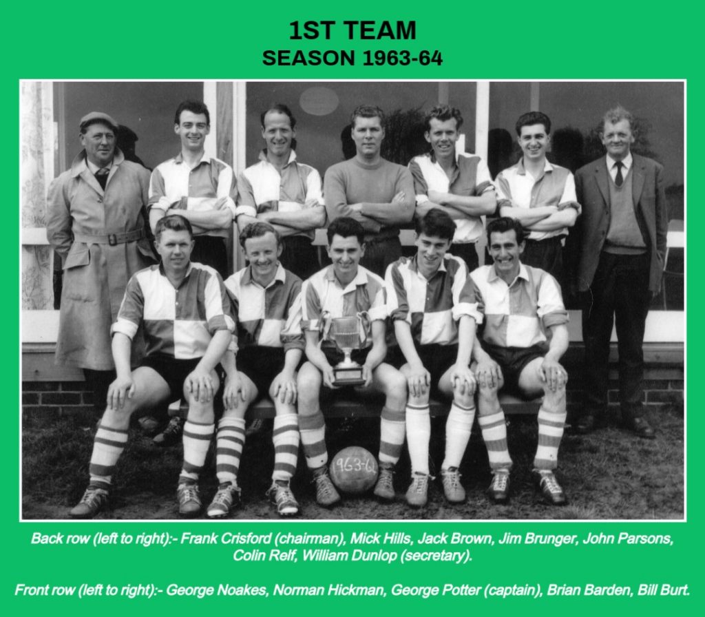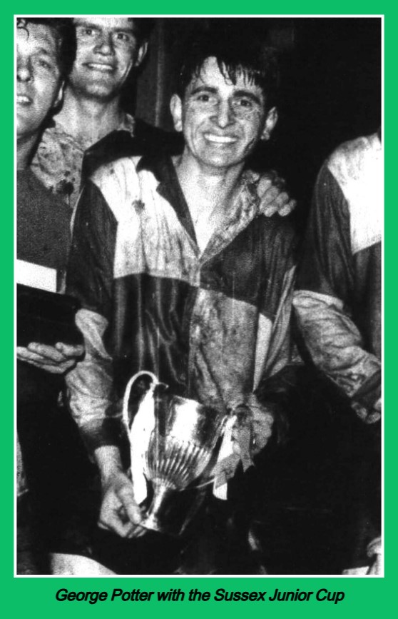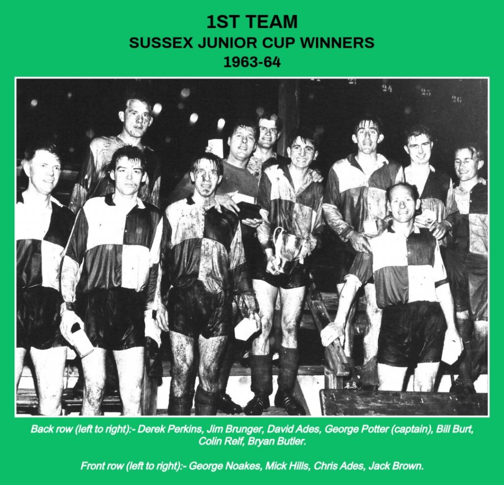 In the Sussex Junior Cup, the 1st team beat Birds Eye (5-2), Brighton Segas (7-2), Buxted (3-1), Burwash (3-2), Drive United, the holders (3-2), Eastbourne Working Men’s Club (6-5) in the semi-final and Longley’s Sports (Crawley) (2-0) in the final at the Saffrons, Eastbourne. The side were at home in all the ties except Brighton Segas, played at Fishersgate and the final itself. The team in the final was: Jim Brunger, Michael Hills, George Potter (captain), Derek Perkins, Jack Brown, Bryan Butler, George Noakes, Colin Relf, Chris Ades, David Ades and Bill Burt. A Celebration Dinner was arranged by the club to mark the achievement.