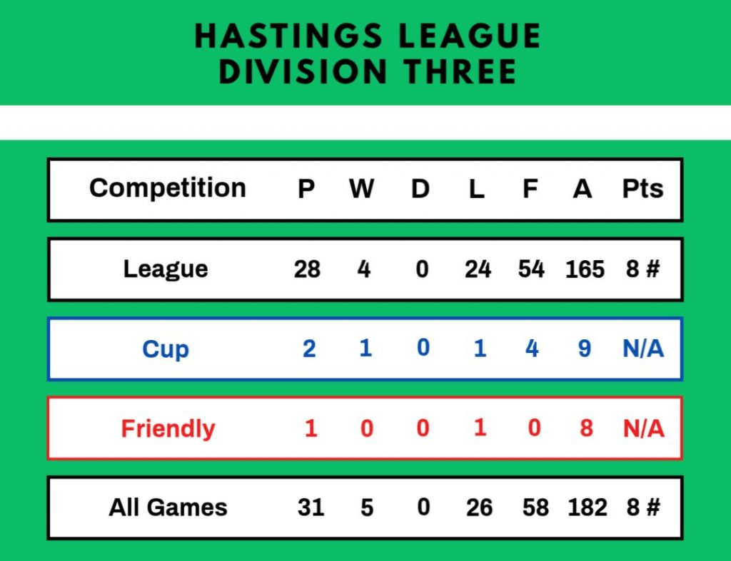 2/11/1963 | Sedlescombe | Home | League | 0 – 8 | |