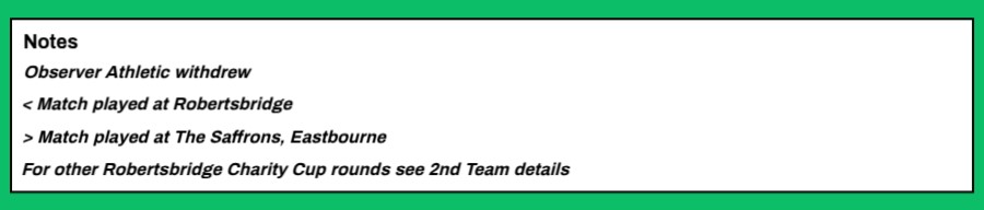 25/1/1964 | Robertsbridge United | Home | Robertsbridge Charity Cup 2nd Round | 5 – 0 | Peter Turner 2, Bernard Rankin 2, Howard Hunt |