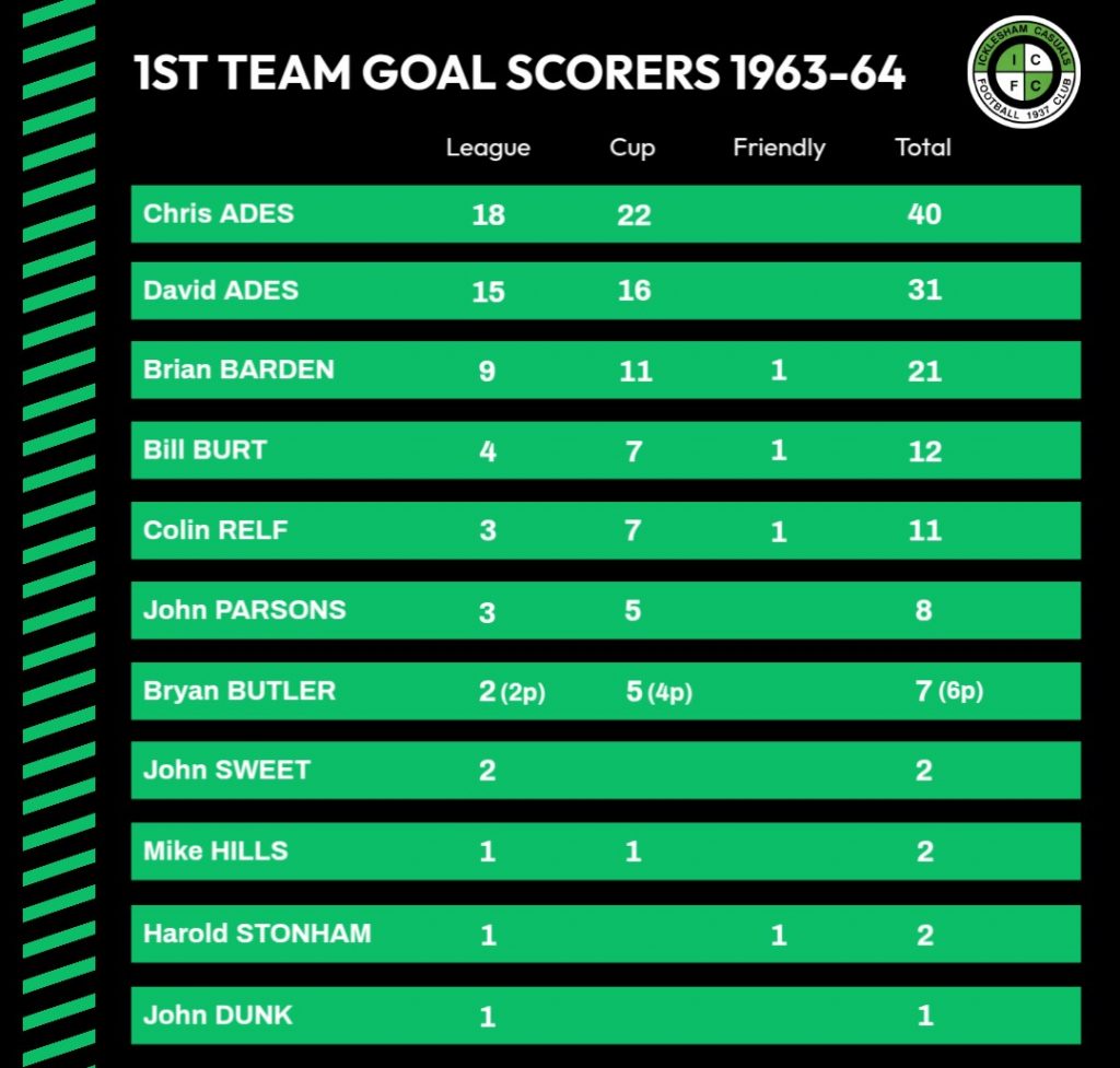 29/2/1964 | Weald Electricity | Away | League | 10 – 2 | Chris Ades 6, David Ades 2, John Sweet, Harold Stonham |