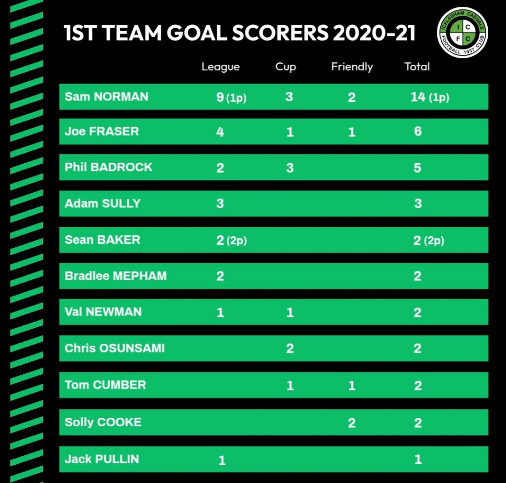Sam Norman finished as leading goal scorer with 14 goals in all matches. No end of season awards were made due to the curtailed season and the Covid 19 restrictions that were still in place.
