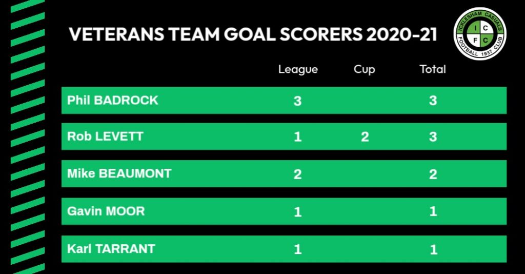 | 25/10/2020 | Sidley United Veterans | Away< | League | 4 – 2 | Mike Beaumont 2, Phil Badrock, Rob Levett |