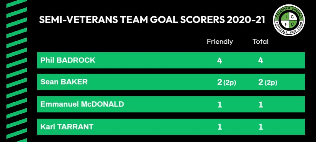 | 26/8/2020 | Sedlescombe Rangers Veterans | Home | Friendly | 3 – 3 | Sean Baker 2 (2 pens), Phil Badrock |